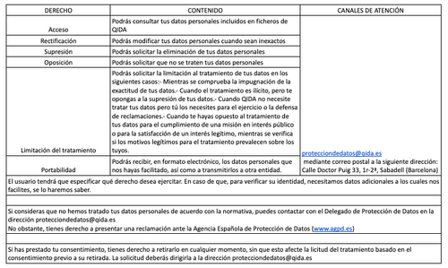 Los datos personales que las personas interesadas hayan librado a QIDA se tratarán únicamente con el fin de qué fueron informadas.